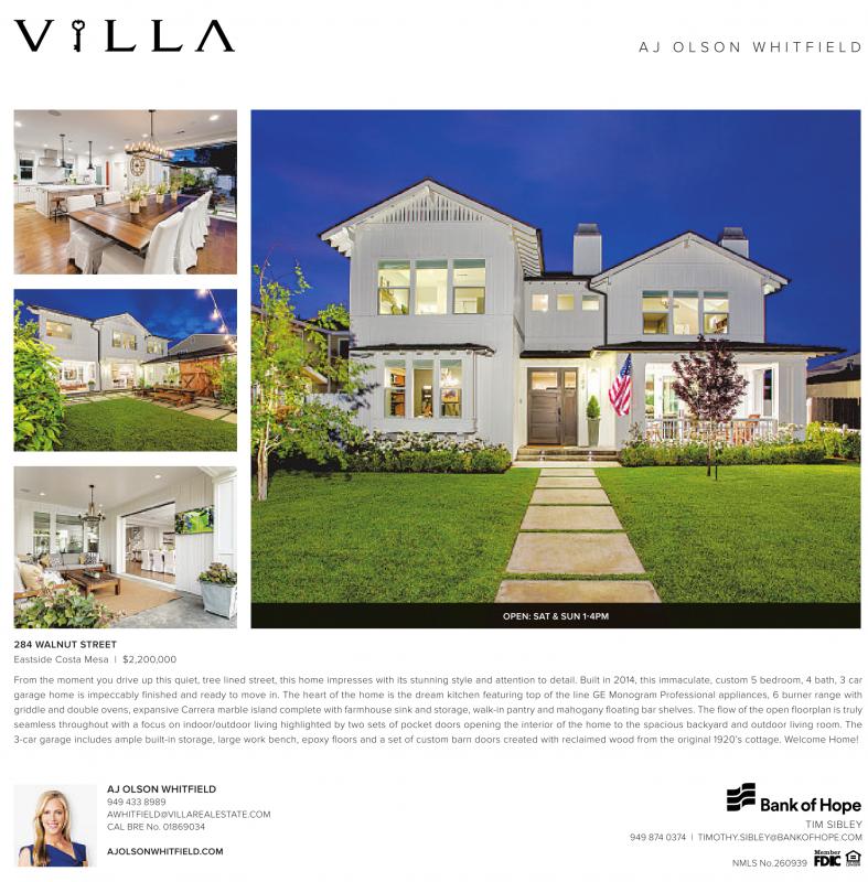 A J O L S O N W H I T F I E L D OPEN: SAT &SUN 1-4PM 284 WALNUT STREET Eastside Costa Mesa | $2,200,000 From the moment you drive up this quiet, tree lined street, this home impresses with its stunning style and attention to detail. Built in 2014, this immaculate, custom 5 bedroom, 4 bath, 3 car garage home is impeccably finished and ready to move in. The heart of the home is the dream kitchen featuring top of the line GE Monogram Professional appliances, 6 burner range with griddle and double ovens, expansive Carrera marble island complete with farmhouse sink and storage, walk-in pantry and mahogany floating bar shelves. The flow of the open floorplan is truly seamless throughout with a focus on indoor/outdoor living highlighted by two sets of pocket doors opening the interior of the home to the spacious backyard and outdoor living room. The 3-car garage includes ample built-in storage, large work bench, epoxy floors and a set of custom barn doors created with reclaimed wood from the original 1920’s cottage. Welcome Home! AJ OLSON WHITFIELD 949 433 8989 AWHITFIELD@VILLAREALESTATE.COM CAL BRE No. 01869034 AJOLSONWHITFIELD.COM TIM SIBLEY 949 874 0374 | TIMOTHY.SIBLEY@BANKOFHOPE.COM NMLS No.260939