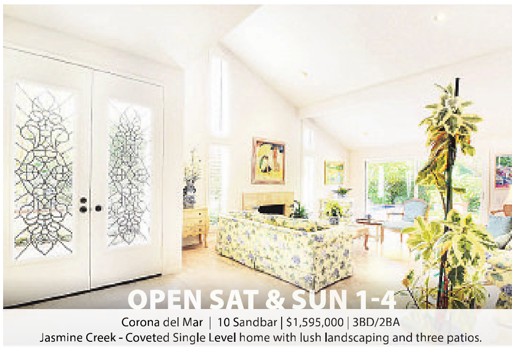 Corona del Mar | 10 Sandbar | $1,595,000 | 3BD/2BA Jasmine Creek - Coveted Single Level home with lush landscaping and three patios.