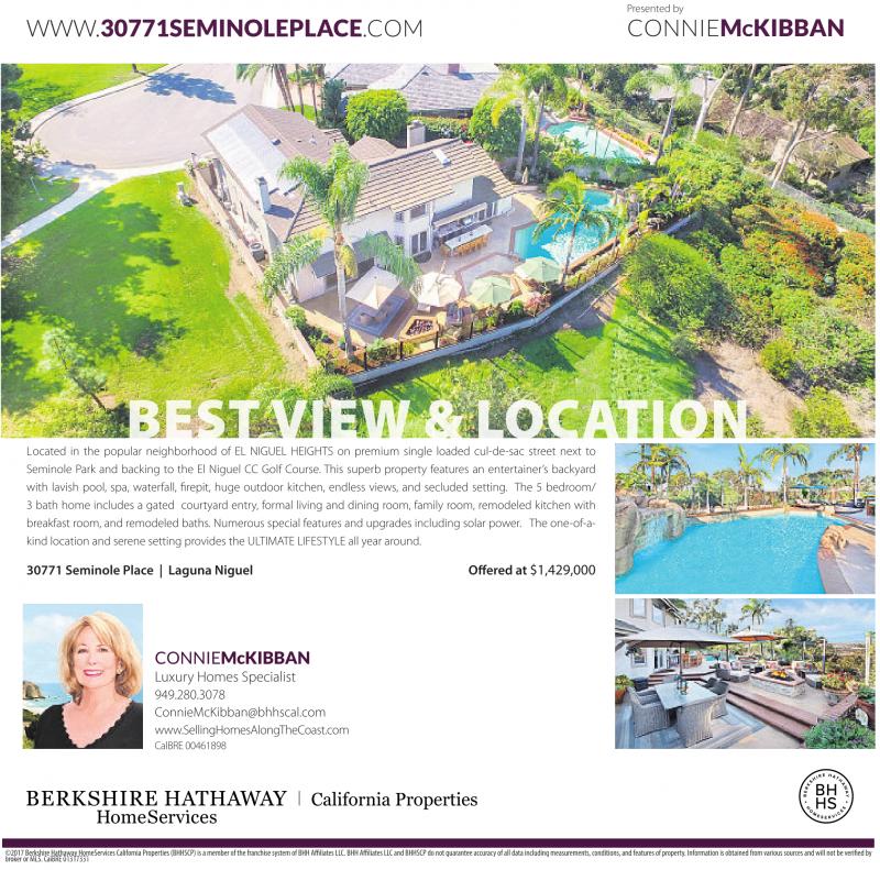WWW.30771SEMINOLEPLACE.COM Presentedby CONNIEMCKIBBAN B S & OC O Located in the popular neighborhood of EL NIGUEL HEIGHTS on premium single loaded cul-de-sac street next to Seminole Park and backing to the El Niguel CC Golf Course. This superb property features an entertainer’s backyard with lavish pool, spa, waterfall, firepit, huge outdoor kitchen, endless views, and secluded setting. The 5 bedroom/ 3 bath home includes a gated courtyard entry, formal living and dining room, family room, remodeled kitchen with breakfast room, and remodeled baths. Numerous special features and upgrades including solar power. The one-of-akind location and serene setting provides the ULTIMATE LIFESTYLE all year around. 30771 Seminole Place | Laguna Niguel Offered at $1,429,000 CONNIEMcKIBBAN Luxury Homes Specialist 949.280.3078 ConnieMcKibban@bhhscal.com www.SellingHomesAlongTheCoast.com CalBRE 00461898 ©2017BerkshireHathawayHomeServicesCaliforniaProperties(BHHSCP)isamemberofthefranchisesystemofBHHAffiliatesLLC.BHHAffiliatesLLCandBHHSCPdonotguaranteeaccuracyofalldataincludingmeasurements,conditions,andfeaturesofproperty.Informationisobtainedfromvarioussourcesandwillnotbeverifiedby broker or MLS. CalBRE 01317331