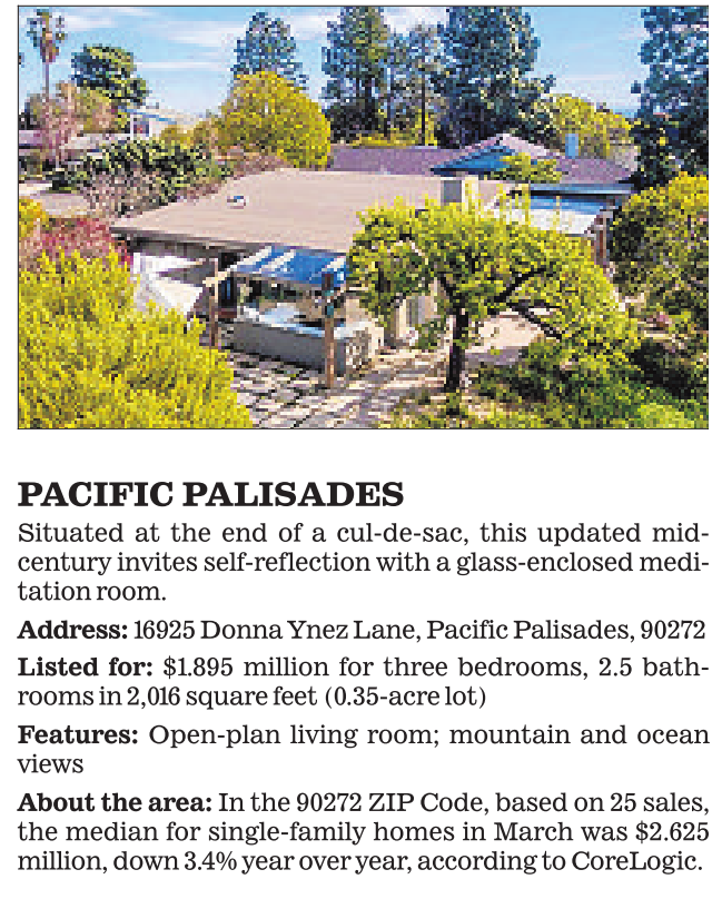 About the area: In the 90272 ZIP Code, based on 25 sales, the median for single-family homes in March was $2.625 million, down 3.4% year over year, according to CoreLogic.