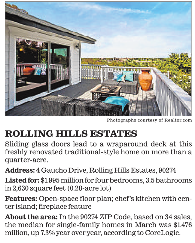 Photographs courtesy of Realtor.com ROLLING HILLS ESTATES Sliding glass doors lead to a wraparound deck at this freshly renovated traditional-style home on more than a quarter-acre. Address: 4 Gaucho Drive, Rolling Hills Estates, 90274 Listed for: $1.995 million for four bedrooms, 3.5 bathrooms in 2,630 square feet (0.28-acre lot) Features: Open-space floor plan; chef’s kitchen with center island; fireplace feature About the area: In the 90274 ZIP Code, based on 34 sales, the median for single-family homes in March was $1.476 million, up 7.3% year over year, according to CoreLogic.