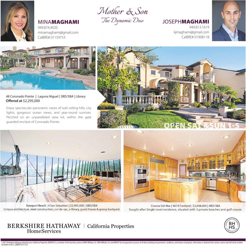 MINAMAGHAMI 949.874.4020 minamaghami@gmail.com CalBRE# 01159753 JOSEPHMAGHAMI 949.813.1619 kjmaghami@gmail.com CalBRE# 01908118 48 Coronado Pointe | Laguna Niguel | 5BD/5BA | Library Offered at $2,295,000 Enjoy spectacular panoramic views of lush rolling hills, city lights, gorgeous ocean views, and year-round sunrises. Perched on an unparalleled view lot, within the gate guarded enclave of Coronado Pointe. OPEN SAT &SUN 1-5 Newport Beach | 4 San Sebastian | $2,995,000 | 5BD/5BA Unique architecture, steel construction, cul-de-sac, a library, guest house & grassy backyard. Corona Del Mar | 4614 Cortland | $2,698,000 | 4BD/3BA Sought after Single Level residence, situated with 3 private beaches and golf course. ©2017BerkshireHathawayHomeServicesCaliforniaProperties(BHHSCP)isamemberofthefranchisesystemofBHHAffiliatesLLC.BHHAffiliatesLLCandBHHSCPdonotguaranteeaccuracyofalldataincludingmeasurements,conditions,andfeaturesofproperty.Informationisobtainedfromvarioussourcesandwillnotbeverified bybroker or MLS. CalBRE# 01317331 See also