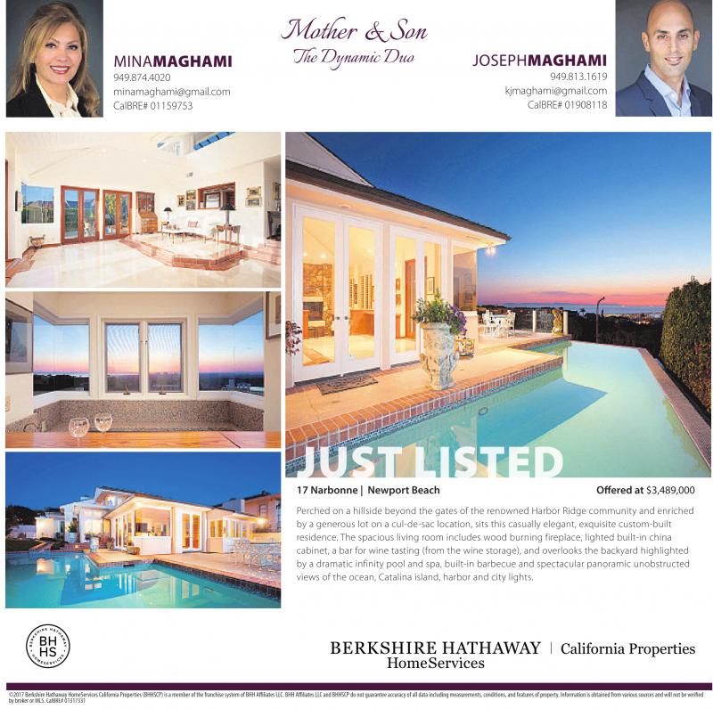 MINAMAGHAMI 949.874.4020 minamaghami@gmail.com CalBRE# 01159753 JOSEPHMAGHAMI 949.813.1619 kjmaghami@gmail.com CalBRE# 01908118 JUS S D 17 Narbonne | Newport Beach Offered at $3,489,000 Perched on a hillside beyond the gates of the renowned Harbor Ridge community and enriched by a generous lot on a cul-de-sac location, sits this casually elegant, exquisite custom-built residence. The spacious living room includes wood burning fireplace, lighted built-in china cabinet, a bar for wine tasting (from the wine storage), and overlooks the backyard highlighted by a dramatic infinity pool and spa, built-in barbecue and spectacular panoramic unobstructed views of the ocean, Catalina island, harbor and city lights. ©2017BerkshireHathawayHomeServicesCaliforniaProperties(BHHSCP)isamemberofthefranchisesystemofBHHAffiliatesLLC.BHHAffiliatesLLCandBHHSCPdonotguaranteeaccuracyofalldataincludingmeasurements,conditions,andfeaturesofproperty.Informationisobtainedfromvarioussourcesandwillnotbeverified bybroker or MLS. CalBRE# 01317331 See also