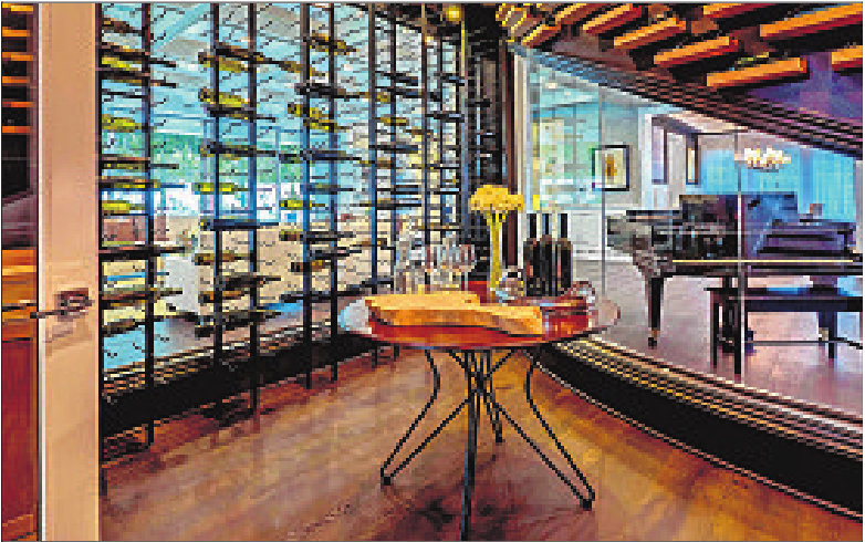 built-ins and a glass-enclosed wine cellar beneath the stairs.