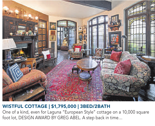 WISTFUL COTTAGE | $1,795,000 | 3BED/2BATH One ofakind, even for Laguna “European Style” cottage ona10,000 square foot lot, DESIGN AWARD BY GREG ABEL. Astep back intime…