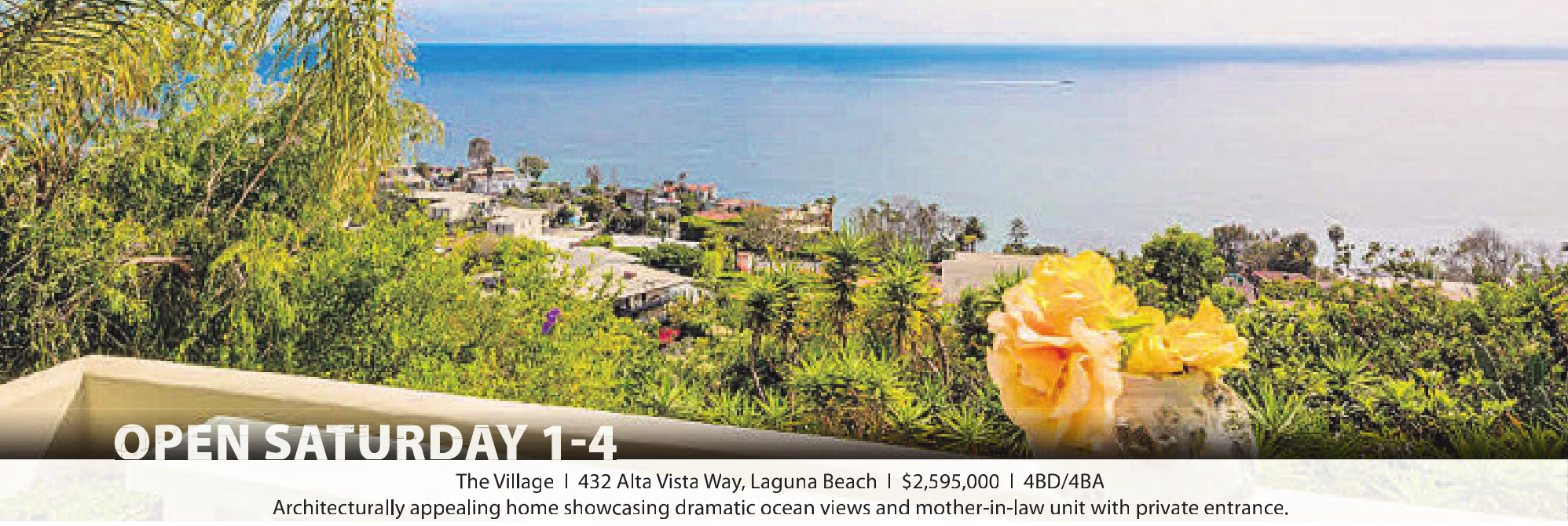 TheVillage l 432 AltaVistaWay, Laguna Beach l $2,595,000 l 4BD/4BA Architecturally appealing home showcasing dramatic ocean views and mother-in-law unit with private entrance.