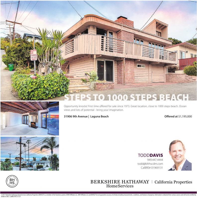 S S O 000 S S B C Opportunity knocks! First time offered for sale since 1973. Great location, close to 1000 steps beach. Ocean views and lots of potential - bring your imagination. 31906 9th Avenue | Laguna Beach Offered at $1,195,000 TODDDAVIS 949.447.4444 todd@bhhscdm.com CalBRE# 01969131 ©2017BerkshireHathawayHomeServicesCaliforniaProperties(BHHSCP)isamemberofthefranchisesystemofBHHAffiliatesLLC.BHHAffiliatesLLCandBHHSCPdonotguaranteeaccuracyofalldataincludingmeasurements,conditions,andfeaturesofproperty.Informationisobtainedfromvarioussourcesandwillnotbeverifiedby broker or MLS. CalBRE #01317331