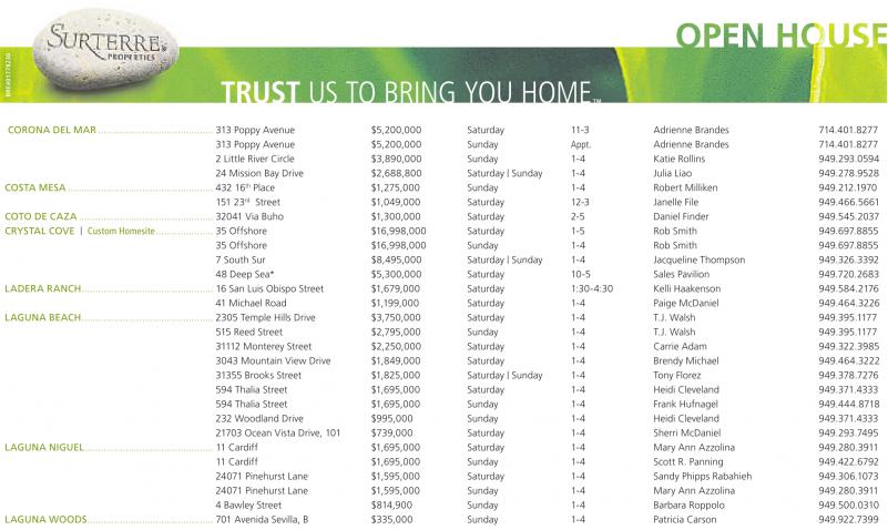 CORONA DEL MAR .......................................... 313 Poppy Avenue $5,200,000 Saturday 11-3 Adrienne Brandes 714.401.8277 313 Poppy Avenue $5,200,000 Sunday Appt. Adrienne Brandes 714.401.8277 2 Little River Circle $3,890,000 Sunday 1-4 Katie Rollins 949.293.0594 24 Mission Bay Drive $2,688,800 Saturday | Sunday 1-4 Julia Liao 949.278.9528 COSTA MESA ..................................................... 432 16 th Place $1,275,000 Sunday 1-4 Robert Milliken 949.212.1970 151 23 rd Street $1,049,000 Saturday 12-3 Janelle File 949.466.5661 COTO DE CAZA ................................................. 32041 Via Buho $1,300,000 Saturday 2-5 Daniel Finder 949.545.2037 CRYSTAL COVE | Custom Homesite..................... 35 Offshore $16,998,000 Saturday 1-5 Rob Smith 949.697.8855 35 Offshore $16,998,000 Sunday 1-4 Rob Smith 949.697.8855 7 South Sur $8,495,000 Saturday | Sunday 1-4 Jacqueline Thompson 949.326.3392 48 Deep Sea* $5,300,000 Saturday 10-5 Sales Pavilion 949.720.2683 LADERA RANCH................................................ 16 San Luis Obispo Street $1,679,000 Saturday 1:30-4:30 Kelli Haakenson 949.584.2176 41 Michael Road $1,199,000 Saturday 1-4 Paige McDaniel 949.464.3226 LAGUNA BEACH................................................ 2305 Temple Hills Drive $3,750,000 Saturday 1-4 T.J. Walsh 949.395.1177 515 Reed Street $2,795,000 Sunday 1-4 T.J. Walsh 949.395.1177 31112 Monterey Street $2,250,000 Saturday 1-4 Carrie Adam 949.322.3985 3043 Mountain View Drive $1,849,000 Saturday 1-4 Brendy Michael 949.464.3222 31355 Brooks Street $1,825,000 Saturday | Sunday 1-4 Tony Florez 949.378.7276 594 Thalia Street $1,695,000 Saturday 1-4 Heidi Cleveland 949.371.4333 594 Thalia Street $1,695,000 Sunday 1-4 Frank Hufnagel 949.444.8718 232 Woodland Drive $995,000 Sunday 1-4 Heidi Cleveland 949.371.4333 21703 Ocean Vista Drive, 101 $739,000 Saturday 1-4 Sherri McDaniel 949.293.7495 LAGUNA NIGUEL............................................... 11 Cardiff $1,695,000 Saturday 1-4 Mary Ann Azzolina 949.280.3911 11 Cardiff $1,695,000 Sunday 1-4 Scott R. Panning 949.422.6792 24071 Pinehurst Lane $1,595,000 Saturday 1-4 Sandy Phipps Rabahieh 949.306.1073 24071 Pinehurst Lane $1,595,000 Sunday 1-4 Mary Ann Azzolina 949.280.3911 4 Bawley Street $814,900 Sunday 1-4 Barbara Roppolo 949.500.0310 LAGUNA WOODS.............................................. 701 Avenida Sevilla, B $335,000 Sunday 1-4 Patricia Carson 949.922.7399