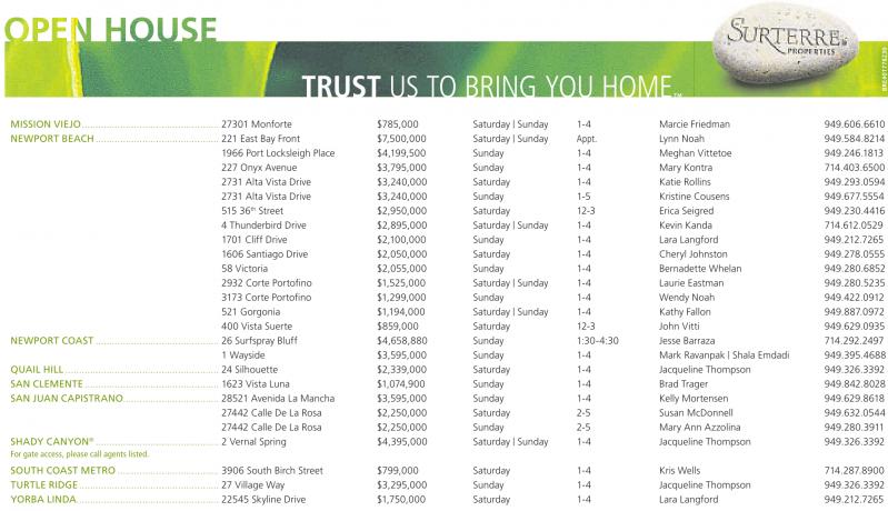 MISSION VIEJO.................................................. 27301 Monforte $785,000 Saturday | Sunday 1-4 Marcie Friedman 949.606.6610 NEWPORT BEACH ............................................. 221 East Bay Front $7,500,000 Saturday | Sunday Appt. Lynn Noah 949.584.8214 1966 Port Locksleigh Place $4,199,500 Sunday 1-4 Meghan Vittetoe 949.246.1813 227 Onyx Avenue $3,795,000 Sunday 1-4 Mary Kontra 714.403.6500 2731 Alta Vista Drive $3,240,000 Saturday 1-4 Katie Rollins 949.293.0594 2731 Alta Vista Drive $3,240,000 Sunday 1-5 Kristine Cousens 949.677.5554 515 36 th Street $2,950,000 Saturday 12-3 Erica Seigred 949.230.4416 4 Thunderbird Drive $2,895,000 Saturday | Sunday 1-4 Kevin Kanda 714.612.0529 1701 Cliff Drive $2,100,000 Sunday 1-4 Lara Langford 949.212.7265 1606 Santiago Drive $2,050,000 Saturday 1-4 Cheryl Johnston 949.278.0555 58 Victoria $2,055,000 Sunday 1-4 Bernadette Whelan 949.280.6852 2932 Corte Portofino $1,525,000 Saturday | Sunday 1-4 Laurie Eastman 949.280.5235 3173 Corte Portofino $1,299,000 Sunday 1-4 Wendy Noah 949.422.0912 521 Gorgonia $1,194,000 Saturday | Sunday 1-4 Kathy Fallon 949.887.0972 400 Vista Suerte $859,000 Saturday 12-3 John Vitti 949.629.0935 NEWPORT COAST ............................................. 26 Surfspray Bluff $4,658,880 Sunday 1:30-4:30 Jesse Barraza 714.292.2497 1 Wayside $3,595,000 Sunday 1-4 Mark Ravanpak | Shala Emdadi 949.395.4688 QUAIL HILL ........................................................ 24 Silhouette $2,339,000 Saturday 1-4 Jacqueline Thompson 949.326.3392 SAN CLEMENTE ................................................. 1623 Vista Luna $1,074,900 Sunday 1-4 Brad Trager 949.842.8028 SAN JUAN CAPISTRANO................................... 28521 Avenida La Mancha $3,595,000 Sunday 1-4 Kelly Mortensen 949.629.8618 27442 Calle De La Rosa $2,250,000 Saturday 2-5 Susan McDonnell 949.632.0544 27442 Calle De La Rosa $2,250,000 Sunday 2-5 Mary Ann Azzolina 949.280.3911 SHADY CANYON ® ............................................. 2 Vernal Spring $4,395,000 Saturday | Sunday 1-4 Jacqueline Thompson 949.326.3392 Forgateaccess,pleasecallagentslisted. SOUTH COAST METRO ..................................... 3906 South Birch Street $799,000 Saturday 1-4 Kris Wells 714.287.8900 TURTLE RIDGE................................................... 27 Village Way $3,295,000 Sunday 1-4 Jacqueline Thompson 949.326.3392 YORBA LINDA.................................................... 22545 Skyline Drive $1,750,000 Saturday 1-4 Lara Langford 949.212.7265