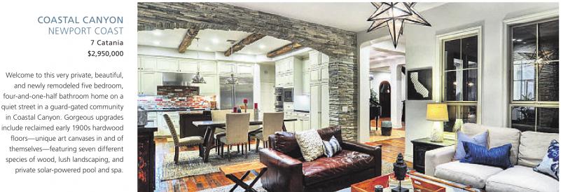 Welcome to this very private, beautiful, and newly remodeled five bedroom, four-and-one-half bathroom home on a quiet street in a guard-gated community in Coastal Canyon. Gorgeous upgrades include reclaimed early 1900s hardwood floors—unique art canvases in and of themselves—featuring seven different species of wood, lush landscaping, and private solar-powered pool and spa.