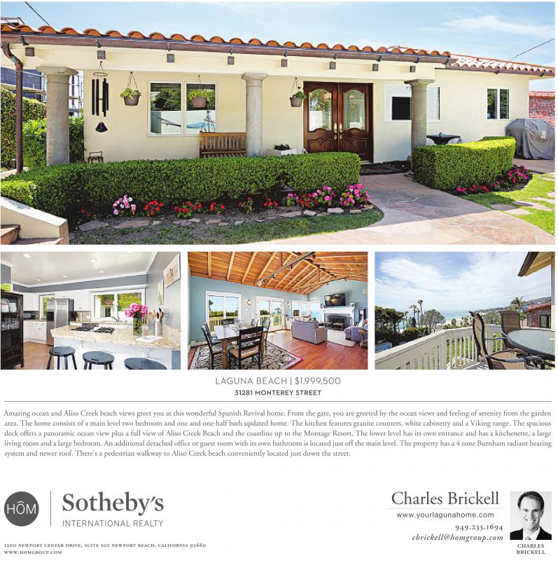 LAGUNA BEACH | $1,999,500 31281 monterey street Amazing ocean and Aliso Creek beach views greet you at this wonderful Spanish Revival home. From the gate, you are greeted by the ocean views and feeling of serenity from the garden area. The home consists of a main level two bedroom and one and one-half bath updated home. The kitchen features granite counters, white cabinetry and a Viking range. The spacious deck offers a panoramic ocean view plus a full view of Aliso Creek Beach and the coastline up to the Montage Resort. The lower level has its own entrance and has a kitchenette, a large living room and a large bedroom. An additional detached office or guest room with its own bathroom is located just off the main level. The property has a 4 zone Burnham radiant heating system and newer roof. There's a pedestrian walkway to Aliso Creek beach conveniently located just down the street. 1200 newport center drive, suite 100 newport beach, california 92660 www.homgroup.com Charles Brickell www.yourlagunahome.com 949.233.1694 cbrickell@homgroup.com charles brickell