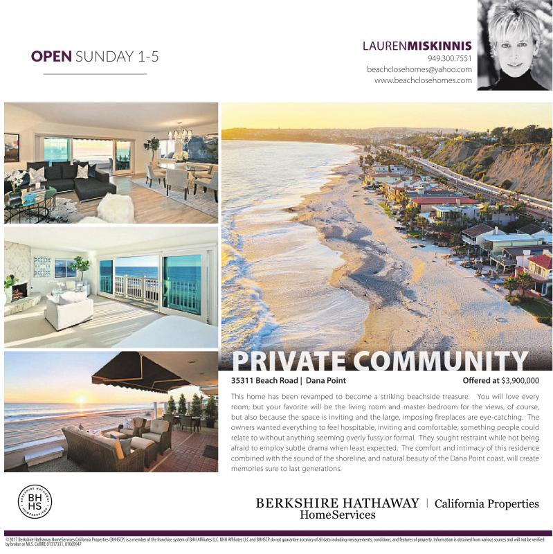 OPEN SUNDAY 1-5 LAURENMISKINNIS 949.300.7551 beachclosehomes@yahoo.com www.beachclosehomes.com PRIVATE COMMUNITY 35311 Beach Road | Dana Point Offered at $3,900,000 This home has been revamped to become a striking beachside treasure. You will love every room; but your favorite will be the living room and master bedroom for the views, of course, but also because the space is inviting and the large, imposing fireplaces are eye-catching. The owners wanted everything to feel hospitable, inviting and comfortable; something people could relate to without anything seeming overly fussy or formal. They sought restraint while not being afraid to employ subtle drama when least expected. The comfort and intimacy of this residence combined with the sound of the shoreline, and natural beauty of the Dana Point coast, will create memories sure to last generations. ©2017BerkshireHathawayHomeServicesCaliforniaProperties(BHHSCP)isamemberofthefranchisesystemofBHHAffiliatesLLC.BHHAffiliatesLLCandBHHSCPdonotguaranteeaccuracyofalldataincludingmeasurements,conditions,andfeaturesofproperty.Informationisobtainedfromvarioussourcesandwillnotbeverified bybroker or MLS. CalBRE 01317331, 01069947