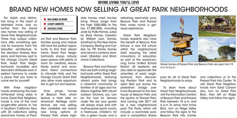 To learn more about Great Park Neighborhoods, visit the Information Centers at Beacon Park and Parasol Park between 10 a.m. and 6 p.m. To arrive, from Irvine Blvd., turn on Ridge Valley and follow the signs to the Beacon Park Info Center