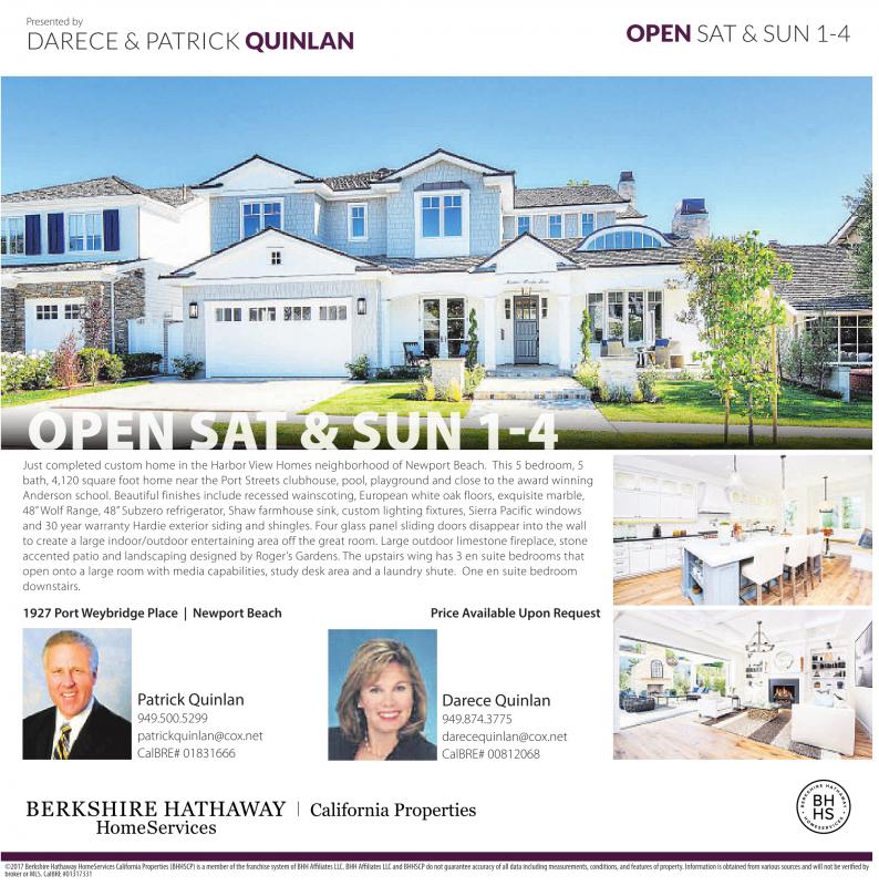 Presented by DARECE & PATRICK QUINLAN OPEN SAT & SUN 1-4 O S & SU Just completed custom home in the Harbor View Homes neighborhood of Newport Beach. This 5 bedroom, 5 bath, 4,120 square foot home near the Port Streets clubhouse, pool, playground and close to the award winning Anderson school. Beautiful finishes include recessed wainscoting, European white oak floors, exquisite marble, 48”Wolf Range, 48” Subzero refrigerator, Shaw farmhouse sink, custom lighting fixtures, Sierra Pacific windows and 30 year warranty Hardie exterior siding and shingles. Four glass panel sliding doors disappear into the wall to create a large indoor/outdoor entertaining area off the great room. Large outdoor limestone fireplace, stone accented patio and landscaping designed by Roger’s Gardens. The upstairs wing has 3 en suite bedrooms that open onto a large room with media capabilities, study desk area and a laundry shute. One en suite bedroom downstairs. 1927 Port Weybridge Place | Newport Beach Price Available Upon Request Patrick Quinlan 949.500.5299 patrickquinlan@cox.net CalBRE# 01831666 Darece Quinlan 949.874.3775 darecequinlan@cox.net CalBRE# 00812068 ©2017BerkshireHathawayHomeServicesCaliforniaProperties(BHHSCP)isamemberofthefranchisesystemofBHHAffiliatesLLC.BHHAffiliatesLLCandBHHSCPdonotguaranteeaccuracyofalldataincludingmeasurements,conditions,andfeaturesofproperty.Informationisobtainedfromvarioussourcesandwillnotbeverifiedby broker or MLS. CalBRE #01317331 See also