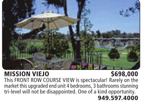 MISSION VIEJO $698,000 This FRONT ROW COURSE VIEW is spectacular! Rarely on the market this upgraded end unit 4bedrooms, 3bathroomsstunning tri-level will notbedisappointed. Oneofakindopportunity.