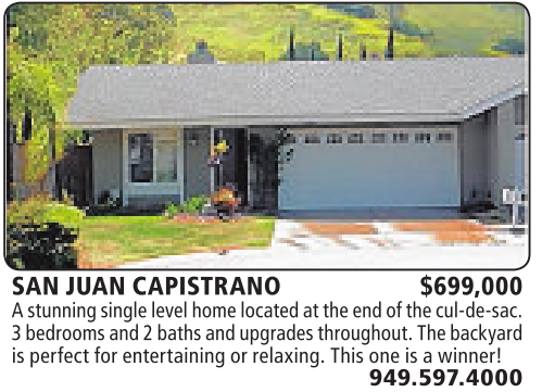 SAN JUAN CAPISTRANO $699,000 Astunning single level home locatedatthe end of thecul-de-sac. 3bedroomsand 2baths andupgrades throughout. Thebackyard