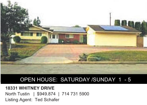 OPEN HOUSE: SATURDAY /SUNDAY 1 - 5 18331 WHITNEY DRIVE North Tustin | $949.874 | 714 731 5900 Listing Agent: Ted Schafer
