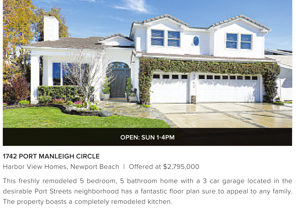 OPEN: SUN 1-4PM 1742 PORT MANLEIGH CIRCLE Harbor View Homes, Newport Beach | Offered at $2,795,000 This freshly remodeled 5 bedroom, 5 bathroom home with a 3 car garage located in the desirable Port Streets neighborhood has a fantastic floor plan sure to appeal to any family. The property boasts a completely remodeled kitchen. See also