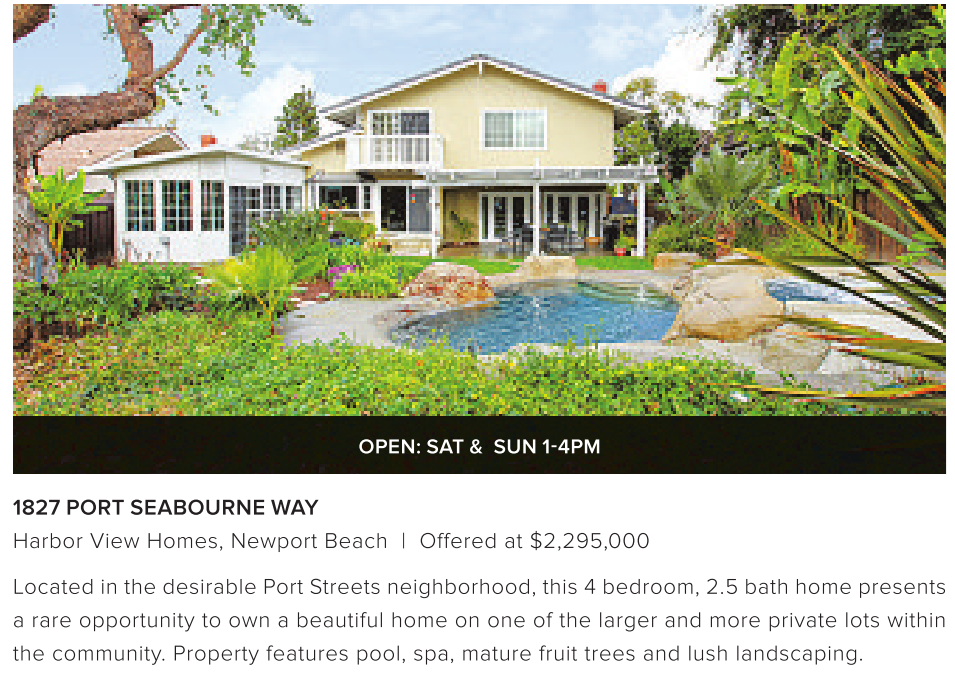 OPEN: SAT & SUN 1-4PM 1827 PORT SEABOURNE WAY Harbor View Homes, Newport Beach | Offered at $2,295,000 Located in the desirable Port Streets neighborhood, this 4 bedroom, 2.5 bath home presents a rare opportunity to own a beautiful home on one of the larger and more private lots within the community. Property features pool, spa, mature fruit trees and lush landscaping. See also