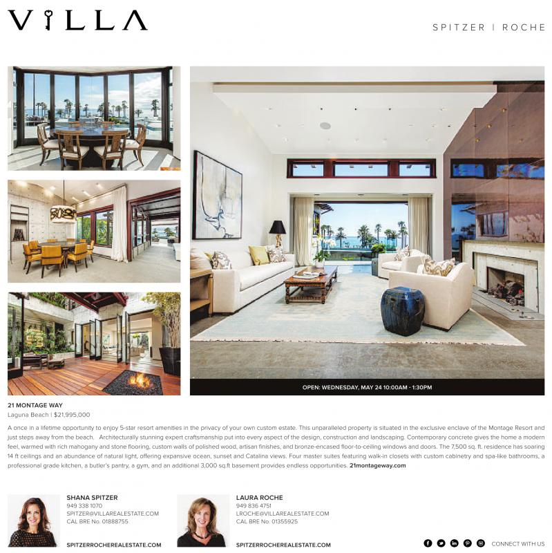 S P I T Z E R | R O C H E OPEN: WEDNESDAY, MAY 24 10:00AM - 1:30PM 21 MONTAGE WAY Laguna Beach | $21,995,000 A once in a lifetime opportunity to enjoy 5-star resort amenities in the privacy of your own custom estate. This unparalleled property is situated in the exclusive enclave of the Montage Resort and just steps away from the beach. Architecturally stunning expert craftsmanship put into every aspect of the design, construction and landscaping. Contemporary concrete gives the home a modern feel, warmed with rich mahogany and stone flooring, custom walls of polished wood, artisan finishes, and bronze-encased floor-to-ceiling windows and doors. The 7,500 sq. ft. residence has soaring 14 ft ceilings and an abundance of natural light, offering expansive ocean, sunset and Catalina views. Four master suites featuring walk-in closets with custom cabinetry and spa-like bathrooms, a professional grade kitchen, a butler’s pantry, a gym, and an additional 3,000 sq.ft basement provides endless opportunities. 21montageway.com SHANA SPITZER 949 338 1070 SPITZER@VILLAREALESTATE.COM CAL BRE No. 01888755 LAURA ROCHE 949 836 4751 LROCHE@VILLAREALESTATE.COM CAL BRE No. 01355925 SPITZERROCHEREALESTATE.COM SPITZERROCHEREALESTATE.COM CONNECT WITH US
