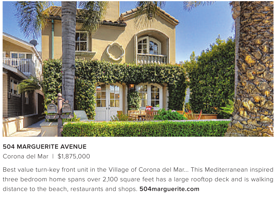 Best value turn-key front unit in the Village of Corona del Mar... This Mediterranean inspired three bedroom home spans over 2,100 square feet has a large rooftop deck and is walking distance to the beach, restaurants and shops. 504marguerite.com