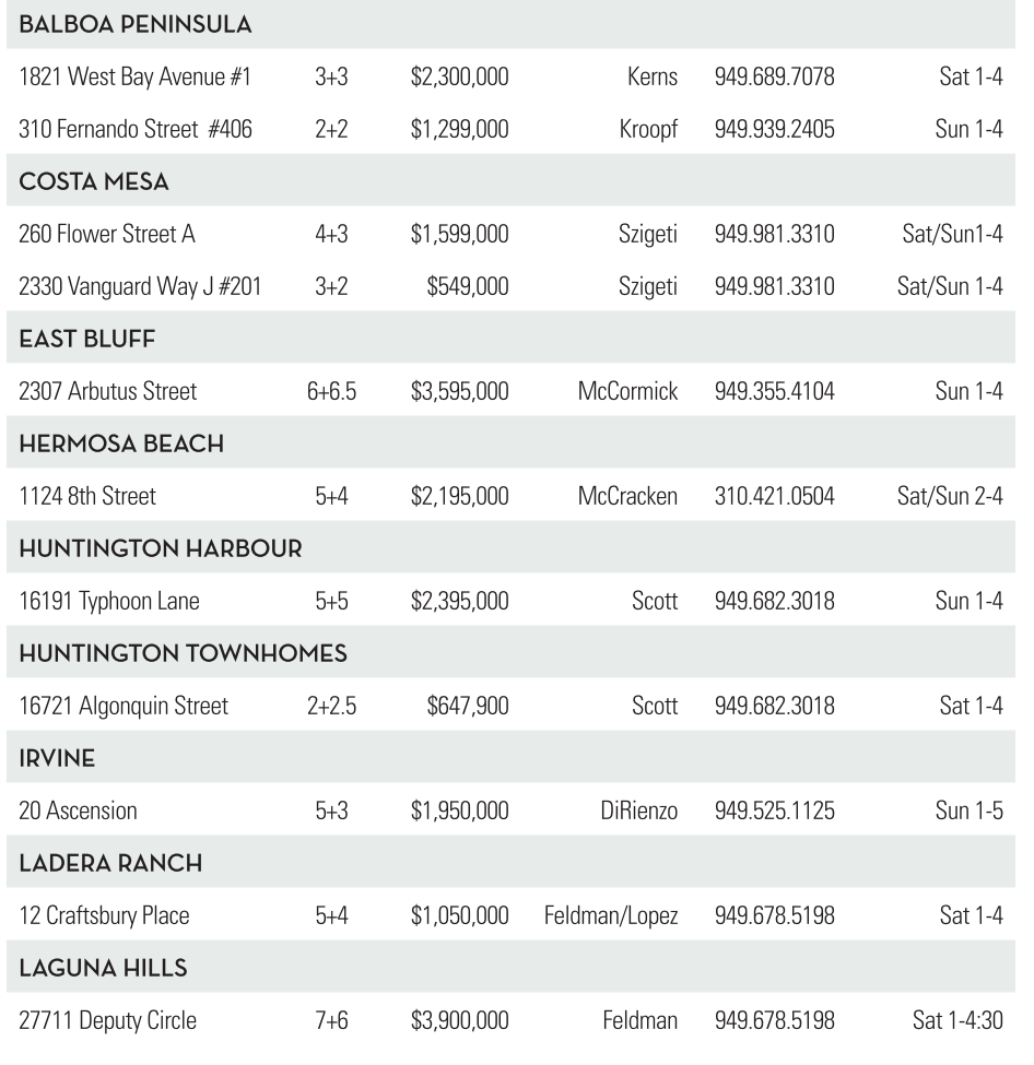 BALBOAPENINSULA 1821 West Bay Avenue #1 3+3 $2,300,000 Kerns 949.689.7078 Sat 1-4 310 Fernando Street #406 2+2 $1,299,000 Kroopf 949.939.2405 Sun 1-4 COSTA MESA 260 Flower Street A 4+3 $1,599,000 Szigeti 949.981.3310 Sat/Sun1-4 2330 Vanguard WayJ#201 3+2 $549,000 Szigeti 949.981.3310 Sat/Sun 1-4 EASTBLUFF 2307 Arbutus Street 6+6.5 $3,595,000 McCormick 949.355.4104 Sun 1-4 HERMOSA BEACH 1124 8th Street 5+4 $2,195,000 McCracken 310.421.0504 Sat/Sun 2-4 HUNTINGTONHARBOUR 16191 Typhoon Lane 5+5 $2,395,000 Scott 949.682.3018 Sun 1-4 HUNTINGTONTOWNHOMES 16721 Algonquin Street 2+2.5 $647,900 Scott 949.682.3018 Sat 1-4 IRVINE 20 Ascension 5+3 $1,950,000 DiRienzo 949.525.1125 Sun 1-5 LADERARANCH 12 Craftsbury Place 5+4 $1,050,000 Feldman/Lopez 949.678.5198 Sat 1-4 LAGUNA HILLS 27711 Deputy Circle 7+6 $3,900,000 Feldman 949.678.5198 Sat 1-4:30
