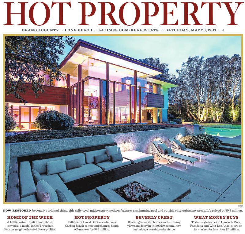HOT PROPERT Y ORANGE COUNTY :: LONG BEACH :: LATIMES.COM/REALESTATE :: SATURDAY, MAY 20, 2017 :: J NOW RESTORED beyond its original shine, this split-level midcentury-modern features a swimming pool and outside entertainment areas. It’s priced at $9.9 million. MRCI HOME OF THE WEEK A 1960s custom-built home, above, served as a model in the Trousdale Estates neighborhood of Beverly Hills. HOT PROPERTY Billionaire David Geffen’s infamous Carbon Beach compound changes hands off-market for $85 million. BEVERLY CREST Boasting beautiful homes and stunning views, modesty in this 90210 community isn’t always considered a virtue. WHAT MONEY BUYS Tudor-style homes in Hancock Park, Pasadena and West Los Angeles are on the market for less than $2 million.