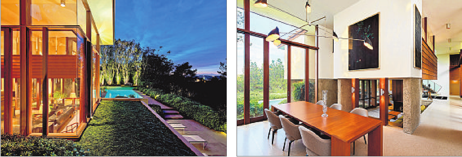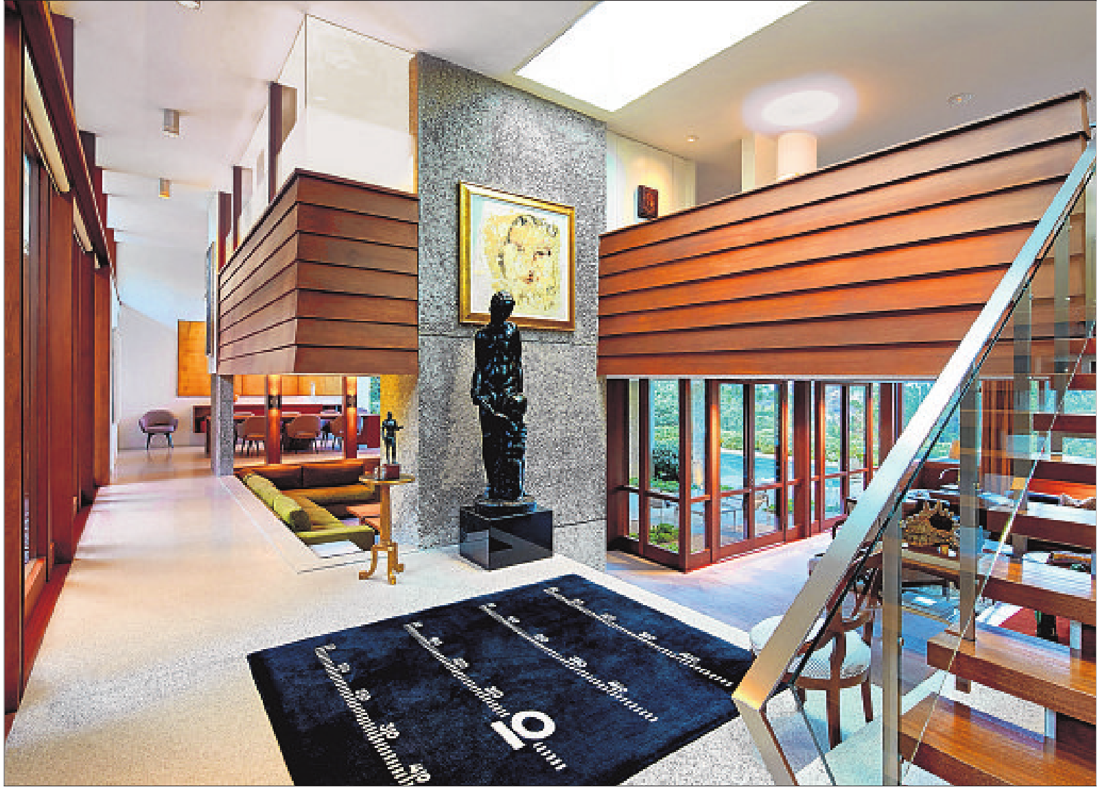 The expanded house has bright interiors that look in on a landscaped interior courtyard with a fountain and open to a swimming pool and outside entertainment areas. A double-height front door leads to a dramatic center hall and atwo-story living room.