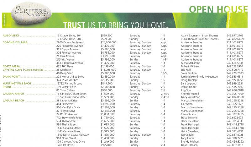 ALISO VIEJO ................................................ 12 Citadel Drive, 204 $599,500 Saturday 1-4 Adam Baumann | Brian Thomas 949.877.2705 12 Citadel Drive, 204 $599,500 Sunday 1-4 Brian Thomas | Jennifer Thomas 949.422.6409 CORONA DEL MAR..................................... 2900 Ocean Boulevard $20,000,000 Saturday | Sunday Appt. Adrienne Brandes 714.401.8277 226 Poinsettia Avenue $7,495,000 Saturday | Sunday Appt. Adrienne Brandes 714.401.8277 313 Poppy Avenue $5,200,000 Saturday | Sunday Appt. Adrienne Brandes 714.401.8277 308 Fernleaf Avenue $4,755,000 Saturday | Sunday Appt. Adrienne Brandes 714.401.8277 213 Iris Avenue $3,995,000 Saturday Appt. Adrienne Brandes 714.401.8277 213 Iris Avenue $3,995,000 Sunday 11-3 Adrienne Brandes 714.401.8277 443.5 Begonia Avenue $1,495,000 Saturday 1-4 Alissa McLarand 949.616.5831 COSTA MESA ............................................... 432 16 th Place $1,199,000 Saturday | Sunday 1-4 Robert Milliken 949.212.1970 CRYSTAL COVE | CustomHomesite ................ 35 Offshore $16,998,000 Saturday | Sunday 1-4 Eric Neff 949.500.7119 48 Deep Sea* $5,300,000 Saturday 10-5 Sales Pavilion 949.720.2683 DANA POINT .............................................. 228 Monarch Bay Drive $2,650,000 Saturday 1-4 Jamie Blakely | Kelly Mortensen 949.533.6511 32432 Via Antibes $2,145,000 Sunday 1-5 Doug Dunlap 949.922.0250 HUNTINGTON BEACH................................. 15732 Plymouth Lane $849,900 Saturday | Sunday 1-4 Sara Legrand 949.939.2231 IRVINE.......................................................... 139 Sunset Cove $2,588,888 Sunday 2-5 Daniel Finder 949.545.2037 85 Twin Gables $950,000 Saturday | Sunday 2-5 Jing Sun 949.680.0818 LADERA RANCH ......................................... 16 San Luis Obispo Street $1,599,900 Saturday 2-4:30 Rhonda Russell 949.395.7399 16 San Luis Obispo Street $1,599,900 Sunday 2-4:30 Tracy Weintraub 949.874.8568 LAGUNA BEACH ......................................... 38 Lagunita Drive $3,695,000 Sunday 1-4 Marcus Skenderian 949.295.5758 464 Hill Street $3,299,000 Saturday 1-4 T.J. Walsh 949.395.1177 906 Van Dyke Drive $2,899,000 Sunday 1-4 Marcus Skenderian 949.295.5758 3213 Tyrol Drive $2,445,000 Saturday 1-4 Marcus Skenderian 949.295.5758 22311 3 rd Avenue $1,830,000 Saturday 1-4 Carrie Adam 949.322.3985 742 Browncroft Road $1,750,000 Saturday 1-4 Tracy Browne 949.697.9974 594 Thalia Street $1,695,000 Saturday 1-4 Heidi Cleveland 949.371.4333 594 Thalia Street $1,695,000 Sunday 1-4 Frank Hufnagel 949.444.8718 1443 Catalina Street $1,595,000 Saturday 1-4 Frank Hufnagel 949.444.8718 1443 Catalina Street $1,595,000 Sunday 1-4 Heidi Cleveland 949.371.4333 1549 North Coast Highway $1,475,000 Saturday | Sunday 1-4 Jenna Bahl 949.887.8725 983 Noria Street $1,450,000 Sunday 1-4 Tony Florez 949.378.7276 190 Canyon Acres Drive $1,249,000 Sunday 1-4 Brendy Michael 949.464.3222 174 Cliff Drive, C $975,000 Sunday 2-4 Traudi Hansen 949.887.3417
