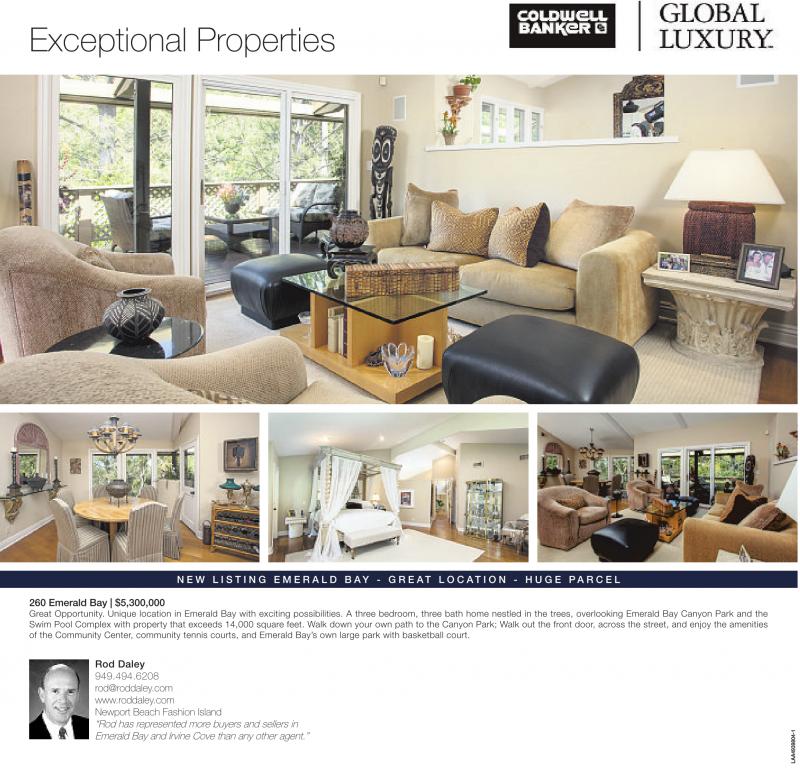 Exceptional Properties N E W L I S T I N G E M E R A L D B AY - G R E AT L O C AT I O N - H U G E PA R C E L 260 Emerald Bay | $5,300,000 Great Opportunity. Unique location in Emerald Bay with exciting possibilities. A three bedroom, three bath home nestled in the trees, overlooking Emerald Bay Canyon Park and the Swim Pool Complex with property that exceeds 14,000 square feet. Walk down your own path to the Canyon Park; Walk out the front door, across the street, and enjoy the amenities of the Community Center, community tennis courts, and Emerald Bay’s own large park with basketball court. Rod Daley 949.494.6208 rod@roddaley.com www.roddaley.com Newport Beach Fashion Island “Rod has represented more buyers and sellers in Emerald Bay and Irvine Cove than any other agent.”
