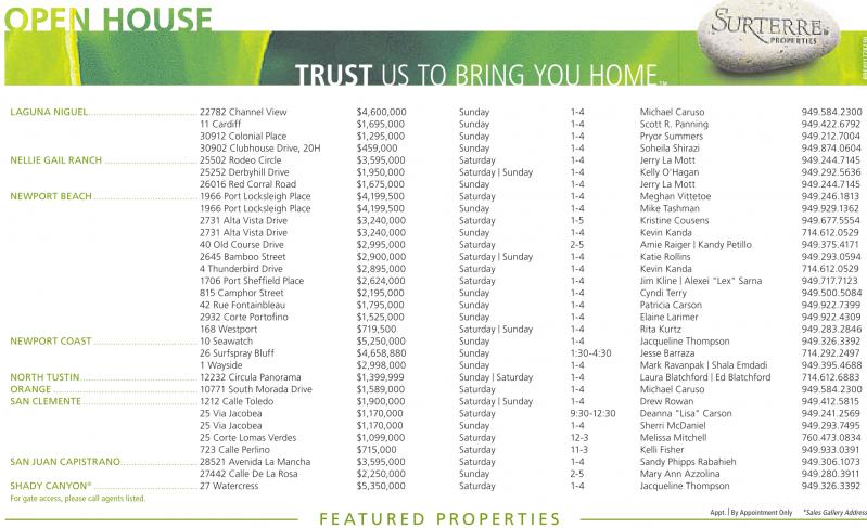 LAGUNA NIGUEL......................................... 22782 Channel View $4,600,000 Sunday 1-4 Michael Caruso 949.584.2300 11 Cardiff $1,695,000 Sunday 1-4 Scott R. Panning 949.422.6792 30912 Colonial Place $1,295,000 Sunday 1-4 Pryor Summers 949.212.7004 30902 Clubhouse Drive, 20H $459,000 Sunday 1-4 Soheila Shirazi 949.874.0604 NELLIE GAIL RANCH ................................... 25502 Rodeo Circle $3,595,000 Saturday 1-4 Jerry La Mott 949.244.7145 25252 Derbyhill Drive $1,950,000 Saturday | Sunday 1-4 Kelly O'Hagan 949.292.5636 26016 Red Corral Road $1,675,000 Sunday 1-4 Jerry La Mott 949.244.7145 NEWPORT BEACH ....................................... 1966 Port Locksleigh Place $4,199,500 Saturday 1-4 Meghan Vittetoe 949.246.1813 1966 Port Locksleigh Place $4,199,500 Sunday 1-4 Mike Tashman 949.929.1362 2731 Alta Vista Drive $3,240,000 Saturday 1-5 Kristine Cousens 949.677.5554 2731 Alta Vista Drive $3,240,000 Sunday 1-4 Kevin Kanda 714.612.0529 40 Old Course Drive $2,995,000 Saturday 2-5 Amie Raiger | Kandy Petillo 949.375.4171 2645 Bamboo Street $2,900,000 Saturday | Sunday 1-4 Katie Rollins 949.293.0594 4 Thunderbird Drive $2,895,000 Saturday 1-4 Kevin Kanda 714.612.0529 1706 Port Sheffield Place $2,624,000 Saturday 1-4 Jim Kline | Alexei "Lex" Sarna 949.717.7123 815 Camphor Street $2,195,000 Sunday 1-4 Cyndi Terry 949.500.5084 42 Rue Fontainbleau $1,795,000 Sunday 1-4 Patricia Carson 949.922.7399 2932 Corte Portofino $1,525,000 Sunday 1-4 Elaine Larimer 949.922.4309 168 Westport $719,500 Saturday | Sunday 1-4 Rita Kurtz 949.283.2846 NEWPORT COAST ....................................... 10 Seawatch $5,250,000 Sunday 1-4 Jacqueline Thompson 949.326.3392 26 Surfspray Bluff $4,658,880 Sunday 1:30-4:30 Jesse Barraza 714.292.2497 1 Wayside $2,998,000 Sunday 1-4 Mark Ravanpak | Shala Emdadi 949.395.4688 NORTH TUSTIN............................................ 12232 Circula Panorama $1,399,999 Sunday | Saturday 1-4 Laura Blatchford | Ed Blatchford 714.612.6883 ORANGE ...................................................... 10771 South Morada Drive $1,589,000 Saturday 1-4 Michael Caruso 949.584.2300 SAN CLEMENTE ........................................... 1212 Calle Toledo $1,900,000 Saturday | Sunday 1-4 Drew Rowan 949.412.5815 25 Via Jacobea $1,170,000 Saturday 9:30-12:30 Deanna "Lisa" Carson 949.241.2569 25 Via Jacobea $1,170,000 Sunday 1-4 Sherri McDaniel 949.293.7495 25 Corte Lomas Verdes $1,099,000 Saturday 12-3 Melissa Mitchell 760.473.0834 723 Calle Perlino $715,000 Saturday 11-3 Kelli Fisher 949.933.0391 SAN JUAN CAPISTRANO............................. 28521 Avenida La Mancha $3,595,000 Saturday 1-4 Sandy Phipps Rabahieh 949.306.1073 27442 Calle De La Rosa $2,250,000 Sunday 2-5 Mary Ann Azzolina 949.280.3911 SHADY CANYON ® ....................................... 27 Watercress $5,350,000 Saturday 1-4 Jacqueline Thompson 949.326.3392 Forgateaccess,pleasecallagentslisted.