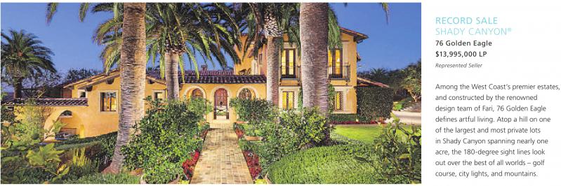 RECORD SALE SHADY CANYON ® 76 Golden Eagle $13,995,000 LP Represented Seller Among the West Coast’s premier estates, and constructed by the renowned design team of Fari, 76 Golden Eagle defines artful living. Atop a hill on one of the largest and most private lots in Shady Canyon spanning nearly one acre, the 180-degree sight lines look out over the best of all worlds – golf course, city lights, and mountains.