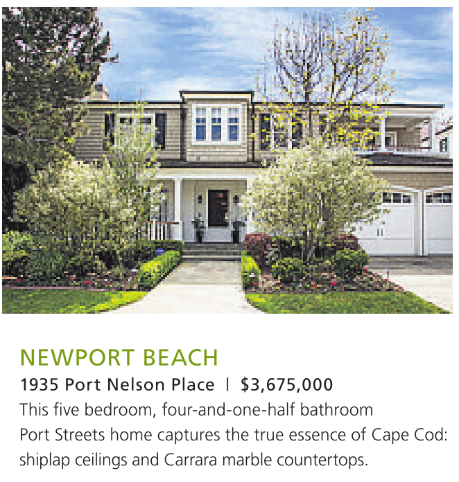 1935 Port Nelson Place | $3,675,000 This five bedroom, four-and-one-half bathroom Port Streets home captures the true essence of Cape Cod: shiplap ceilings and Carrara marble countertops.