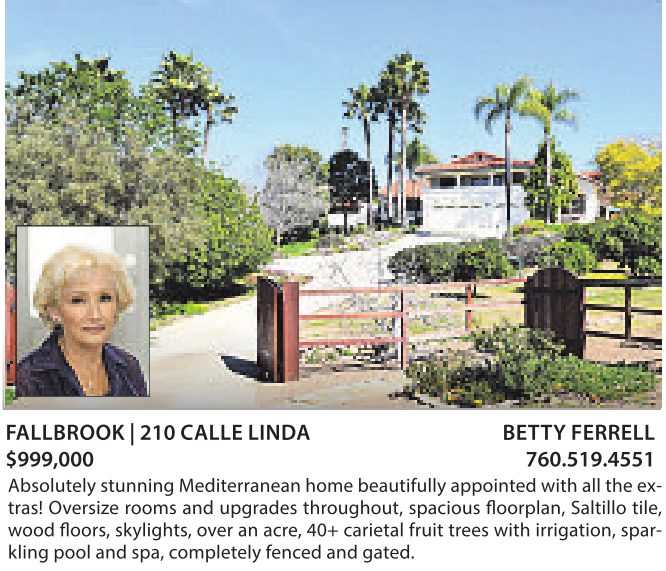 FALLBROOK |210 CALLE LINDA BETTY FERRELL $999,000 760.519.4551 Absolutely stunning Mediterranean home beautifully appointed with all the extras! Oversize rooms and upgrades throughout, spacious floorplan, Saltillo tile, wood floors, skylights, over an acre, 40+ carietal fruit trees with irrigation, sparkling pool and spa, completely fenced andgated.