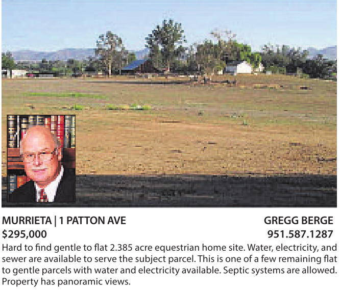 $295,000 951.587.1287 Hardtofind gentle to flat 2.385 acreequestrian home site. Water, electricity, and sewer areavailable to serve the subjectparcel. This is one of afew remaining flat