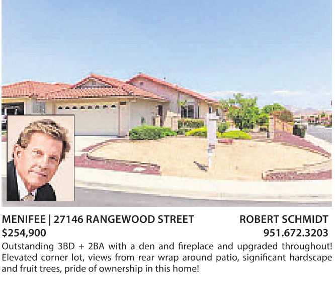 MENIFEE |27146 RANGEWOOD STREET $254,900 951.672.3203 Outstanding 3BD + 2BA with a den and fireplace and upgraded throughout! Elevated corner lot, views from rear wrap around patio, significant hardscape and fruit trees,pride of ownership in this home! ROBERT SCHMIDT
