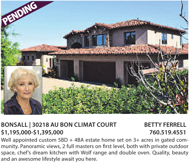 $1,195,000-$1,395,000 760.519.4551 Well appointed custom 5BD + 4BA estate home set on 3+ acres in gated community. Panoramic views, 2full masters on first level, both with private outdoor