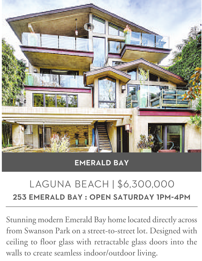 emerald bay LAGUNA BEACH | $6,300,000 253 emerald bay : open saturday 1pm-4pm Stunning modern Emerald Bay home located directly across from Swanson Park on a street-to-street lot. Designed with ceiling to floor glass with retractable glass doors into the walls to create seamless indoor/outdoor living.