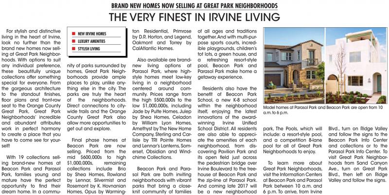 To learn more about Great Park Neighborhoods, visit the Information Centers at Beacon Park and Parasol Park between 10 a.m. and 6 p.m.To arrive, from Irvine