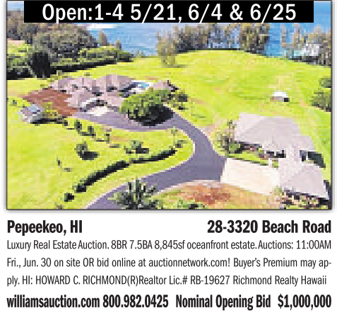 Open:1-4 5/21, 6/4 & 6/25 Pepeekeo, HI 28-3320 BeachRoad LuxuryReal EstateAuction.8BR 7.5BA 8,845sfoceanfront estate.Auctions: 11:00AM Fri., Jun. 30 on site OR bidonline at auctionnetwork.com! Buyer’sPremiummay apply.HI: HOWARD C. RICHMOND(R)Realtor Lic.# RB-19627 Richmond Realty Hawaii williamsauction.com800.982.0425 Nominal OpeningBid $1,000,000