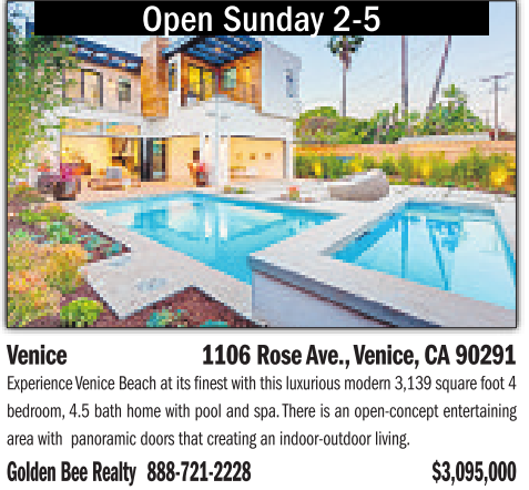 Open Sunday 2-5 Venice 1106 Rose Ave.,Venice, CA 90291 ExperienceVenice Beach at its finest with thisluxurious modern 3,139squarefoot4 bedroom,4.5 bath home with pool andspa.There is an open-concept entertaining area with panoramic doorsthatcreating an indoor-outdoor living. Golden Bee Realty 888-721-2228 $3,095,000