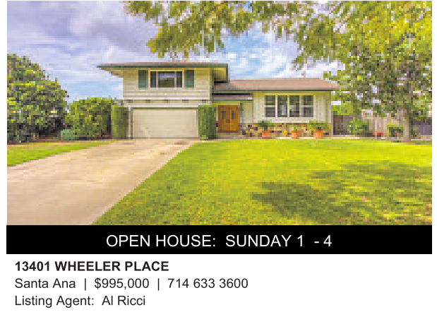 OPEN HOUSE: SUNDAY 1 - 4 13401 WHEELER PLACE Santa Ana | $995,000 | 714 633 3600 Listing Agent: AlRicci