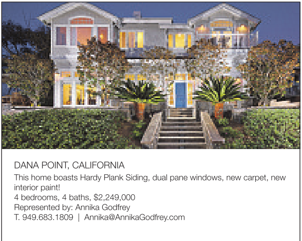 DANA POINT, CALIFORNIA This home boasts Hardy Plank Siding, dual pane windows, new carpet, new interior paint! 4bedrooms, 4baths, $2,249,000 Represented by: Annika Godfrey T. 949.683.1809 | Annika@AnnikaGodfrey.com