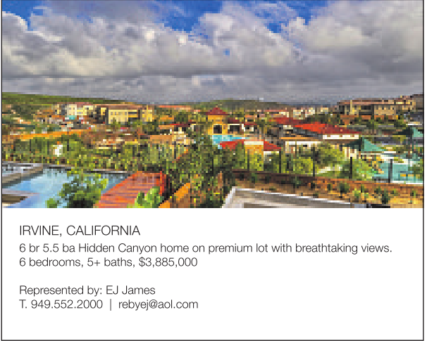 IRVINE, CALIFORNIA 6br5.5 ba Hidden Canyon home on premium lot with breathtaking views. 6bedrooms, 5+ baths, $3,885,000 Represented by: EJ James T. 949.552.2000 | rebyej@aol.com