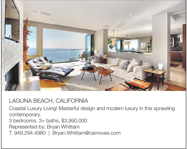 LAGUNA BEACH, CALIFORNIA Coastal Luxury Living! Masterful design and modern luxury in this sprawling contemporary. 3bedrooms, 3+ baths, $3,990,000 Represented by: Bryan Whittam T. 949.294.4980 | Bryan.Whittam@camoves.com