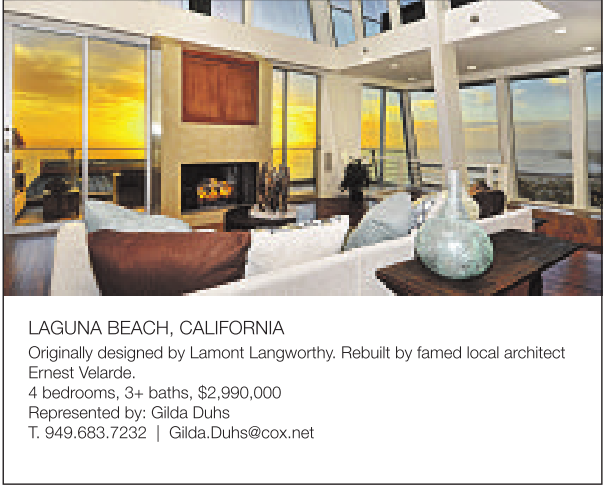 LAGUNA BEACH, CALIFORNIA Originally designed by Lamont Langworthy. Rebuilt by famed local architect Ernest Velarde. 4bedrooms, 3+ baths, $2,990,000 Represented by: Gilda Duhs T. 949.683.7232 | Gilda.Duhs@cox.net