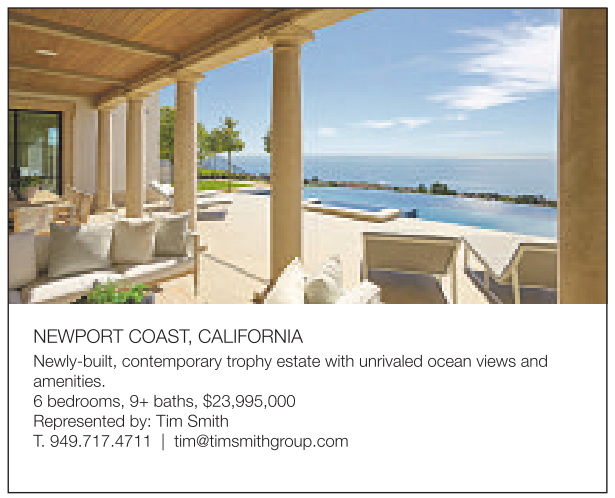 NEWPORT COAST, CALIFORNIA Newly-built, contemporary trophy estate with unrivaled ocean views and amenities. 6bedrooms, 9+ baths, $23,995,000 Represented by: Tim Smith T. 949.717.4711 | tim@timsmithgroup.com
