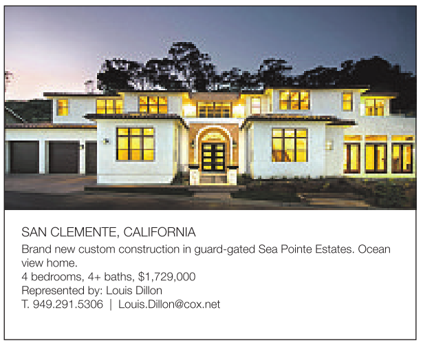 SAN CLEMENTE, CALIFORNIA Brand new custom construction in guard-gated Sea Pointe Estates. Ocean view home. 4bedrooms, 4+ baths, $1,729,000 Represented by: Louis Dillon T. 949.291.5306 | Louis.Dillon@cox.net
