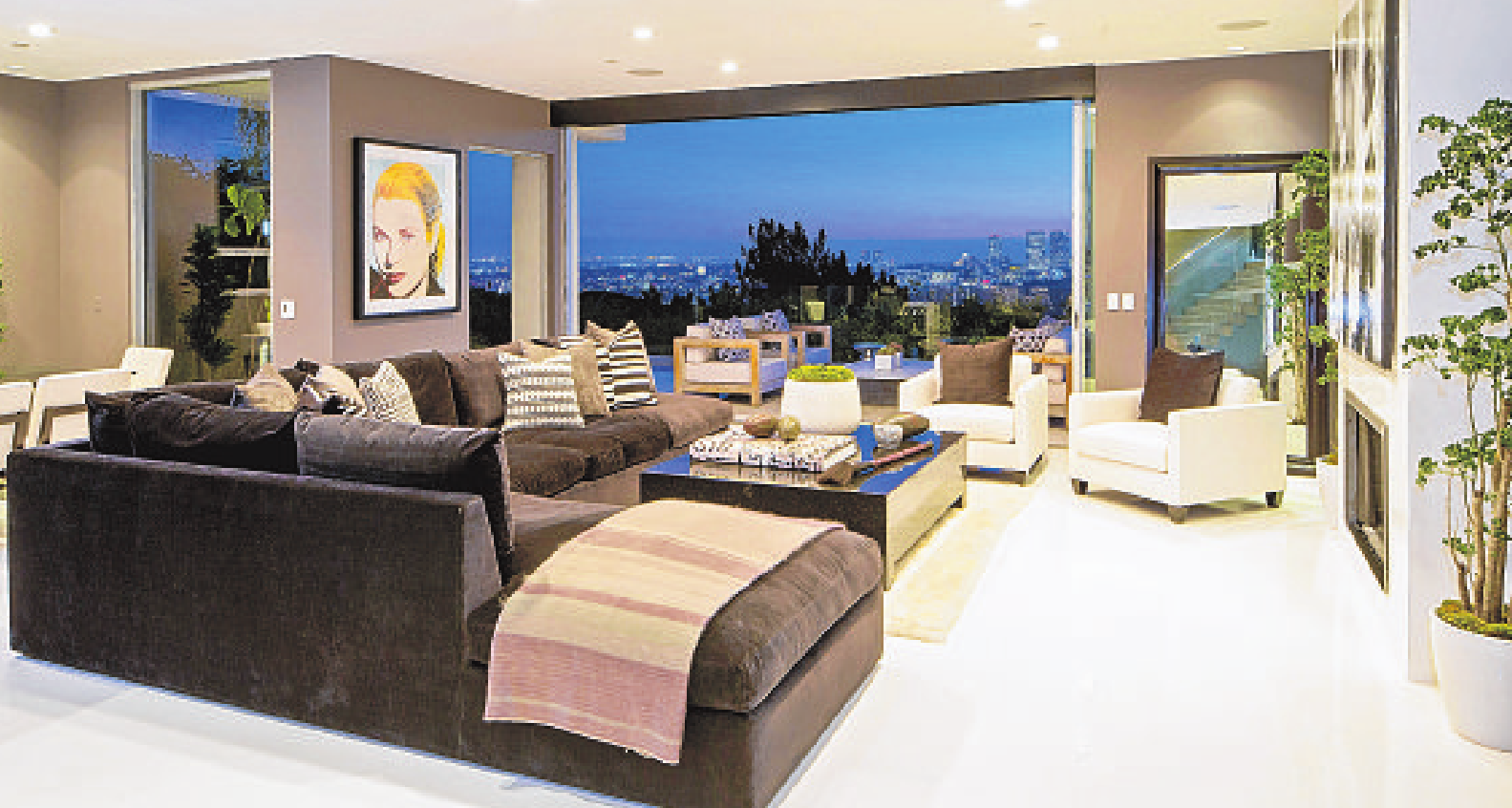 Tucked behind a motorized gate on a quarter-acre lot, the multi-level home boasts an open floor plan and pocketing walls of glass that capitalize on Southern California’s indoor-outdoor lifestyle. Views from the home, set above the Sunset Strip, extend from the downtown cityscape to the ocean.