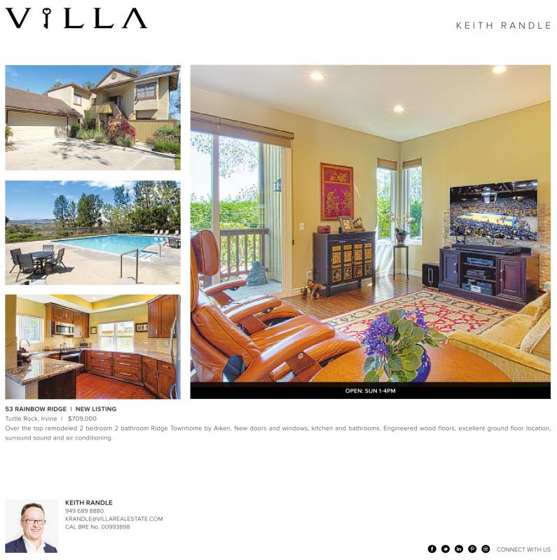 K E I T H R A N D L E OPEN: SUN 1-4PM 53 RAINBOW RIDGE | NEW LISTING Turtle Rock, Irvine | $709,000 Over the top remodeled 2 bedroom 2 bathroom Ridge Townhome by Aiken. New doors and windows, kitchen and bathrooms. Engineered wood floors, excellent ground floor location, surround sound and air conditioning. KEITH RANDLE 949 689 8880 KRANDLE@VILLAREALESTATE.COM CAL BRE No. 00993898 CONNECT WITH US
